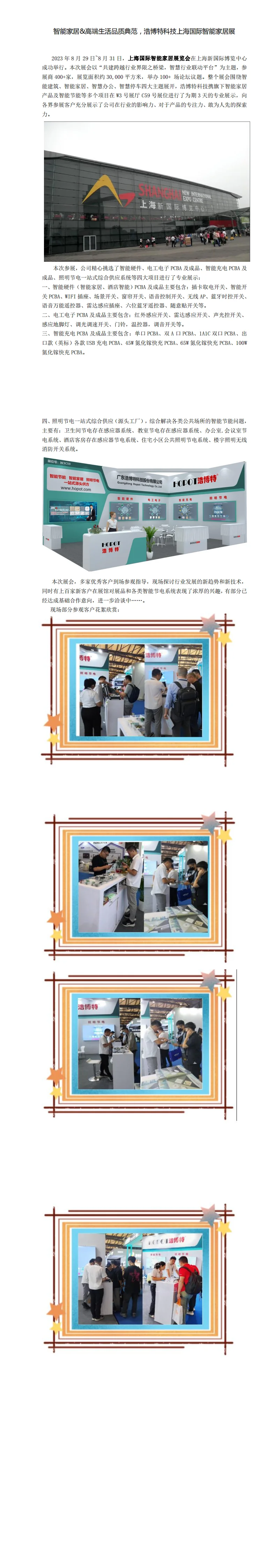 2023 年 8 月 29 日~8 月 31 日,上海国际智能家居展览会在上海新国际博览中心 成功举行。本次展会以“共建跨越行业界限之桥梁,智慧行业联动平台”为主题,参 展商 400+家,展览面积约 30,000 平方米,举办 100+ 场论坛议题。整个展会围绕智 能建筑、智能家居、智慧办公、智慧停车四大主题展开,浩博特科技携旗下智能家居 产品及智能节能等多个项目在 W3 号展厅 C59 号展位进行了为期 3 天的专业展示,向 各界参展客户充分展示了公司在行业的影响力、对于产品的专注力、敢为人先的探索 力。