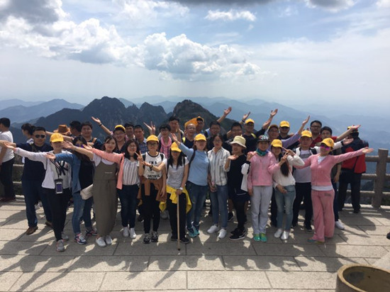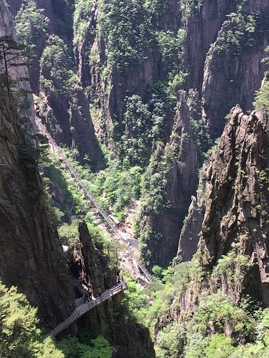 第二日的行程是此次活动的压轴“畅游峥嵘黄山”。前几日景区经过急风骤雨的洗礼,天空湛蓝,空气清新,地面一尘不染。黄山松更加苍翠,树木杂草郁郁葱葱,山花开的更加鲜艳,五颜六色。丛林中随处可见鸟儿欢快的呼叫声,到处是一派生机勃勃的景象。五月的黄山是百花齐放的季节,尤其是山崖上、岩壁下、松林间、游道旁,到处是杜鹃摇曳的身姿。红的像火、粉如霞、白似雪,在绿叶松树的衬托下显得越发娇艳欲滴,轻风过处,花影绰绰,如裙摆飘飘,美艳撩人。丝毫不输给十里桃林,仿佛自己已然成仙,忘记世俗。远眺怪石嶙峋,崖壁似削,危峰兀立,群山起伏,耸入云端。正是“薄海内外,无如徽之黄山。登黄山,天下无山,观止矣!”