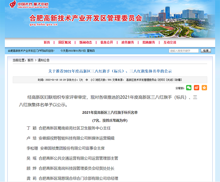 安徽356体育网站股份有限公司监事会主席李松珊女士获评2021年度合肥市yb体育app区“三八红旗手标兵”荣誉称号,这是继2019年度合肥市yb体育app区“三八红旗手”称号之后的又一殊荣。